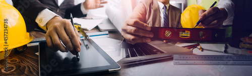engineer working at a drawings of house in office for discussing. Engineering tools and construction concept.