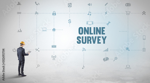 Engineer working on a new social media platform with ONLINE SURVEY inscription concept