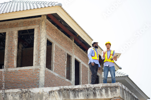 Engineering inspect construction site : construction worker Architects and contractor working together inside building under construction site. Engineering in safety harthat helmet. Engineering team