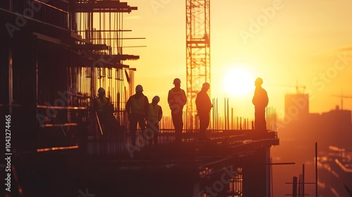 Engineers and construction workers silhouettes on a building site at dusk, with the setting sun casting long shadows and highlighting the busy construction environment