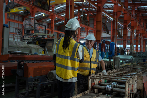 Engineers and staff are inspecting systems and components in a metal sheet and metal roofing manufacturing plant.