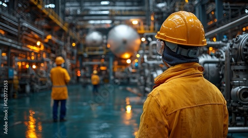 Engineers at a vast industrial site conduct complex checks and maintenance