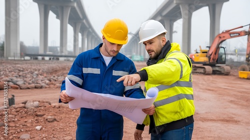 Engineers discussing blueprint at construction site under large bridge infrastructure