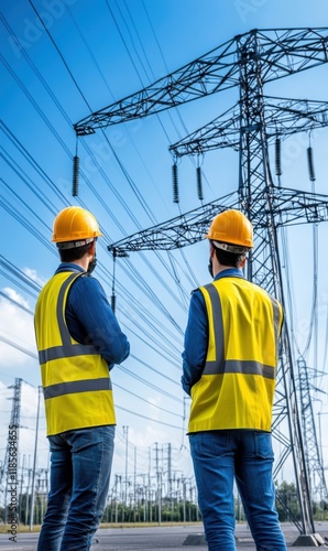 Engineers Inspecting High Voltage Power Lines Under Clear Blue Sky with Transmission Towers in Background