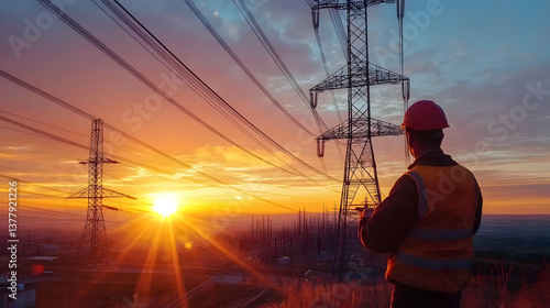 Engineers Inspecting Power Grid Towers at Sunset: Ensuring Reliable Energy Transmission