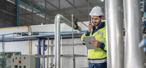 Engineers or utility staff wearing safety helmet fix the machines in the production line. Utility inspector check machine and test the system to meet the standard. machine, Preventive Maintenance