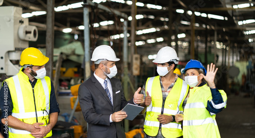 Engineers people are brainstorming solving problems of heavy industrial machinery. Worker man and asian woman wearing face mask prevent covid-19 virus and protective hard hat. .