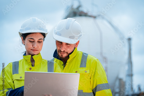Engineers review project plans at a construction site under overcast skies during the afternoon