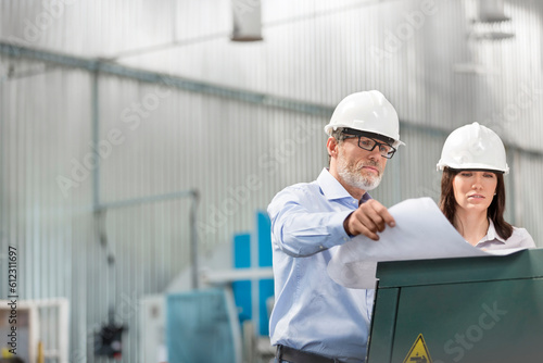 Engineers reviewing blueprints in factory