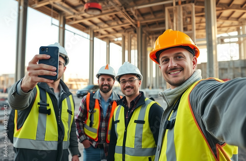 Engineers taking selfie at construction site, workers, labor with safety helmets and vests