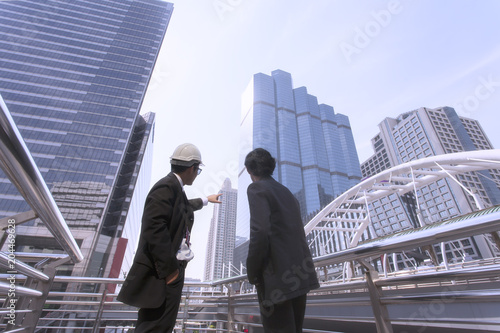 Engineers talk about building project on site.Architects, engineers and consultants in meeting their assigned tasks. A young attractive men construction team on work site wear white helmet safety.