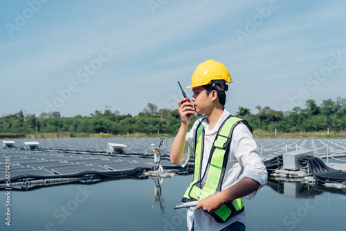 Engineers wearing a uniform inspect and check solar cell panel, solar cell is smart ecology energy sunlight alternative power factory concept.