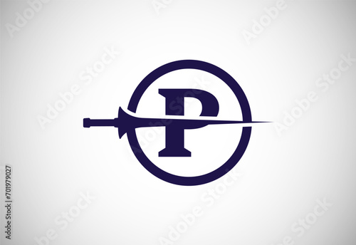 English alphabet P with spear lance. Creative spear logo design template vector illustration