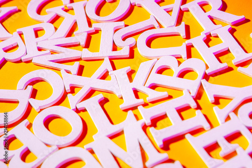 English font. Letters on a yellow background. White font.