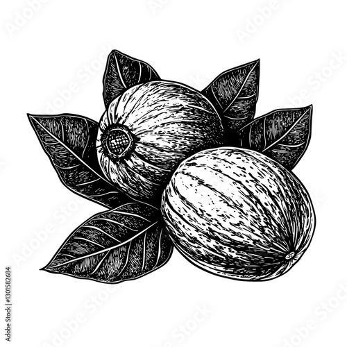 Engraved illustration of two melons surrounded by green leaves showcasing intricate detailing and a vintage style