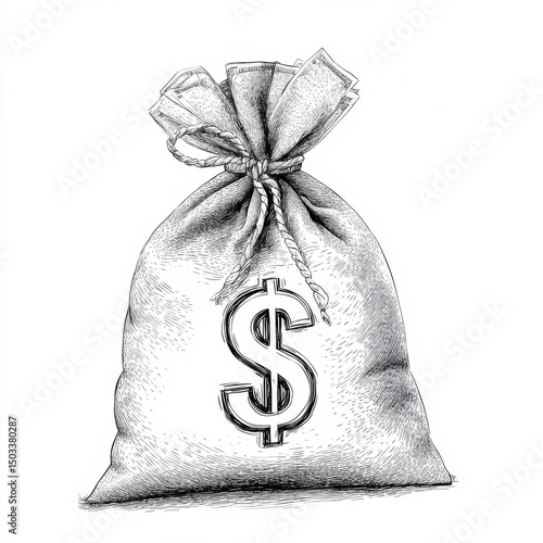 Engraved Money Bag with Dollar Sign, Isolated on White Background, Finance, Wealth