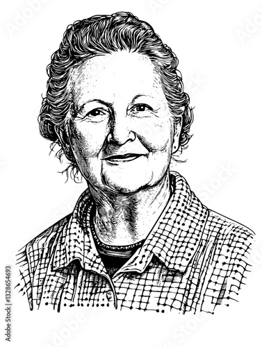 Engraved portrait of an elderly woman with a warm smile, ideal for tattoo design and artistic packaging elements