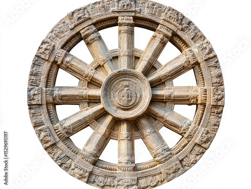 Engraved Sun. Stone Wheel Carving at Konark Sun Temple, India. Isolated on White Background