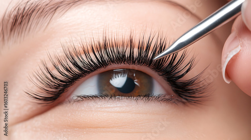 Enhancing Beauty: Close-up of long lashes being applied with precision. The focus on the eye captures the delicate process of eyelash extensions, emphasizing allure.