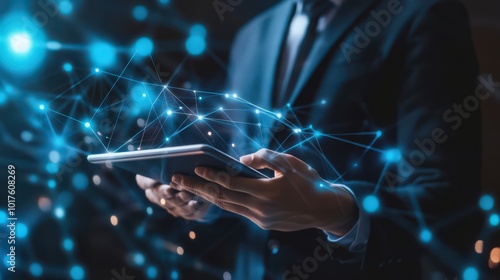 Enhancing CRM, a businessman manages customer relationships using a digital tablet and network technology