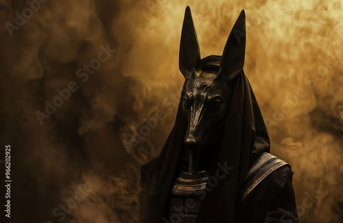 Enigmatic Anubis statue shrouded in golden mist. Ancient Egyptian deity emerges from shadows. Mystical atmosphere evokes power and mythology