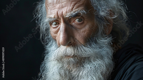 Enigmatic biblical portrait of an elderly man with a flowing white beard and dramatic chiaroscuro, depicting traditional religious iconography.