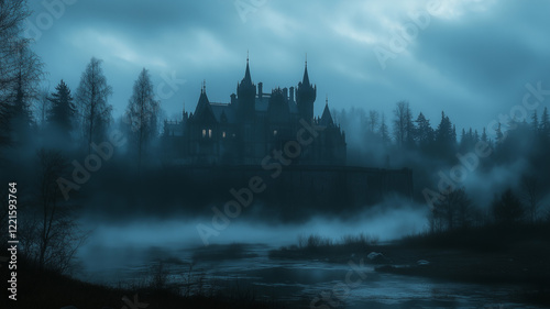 Enigmatic Castle Amidst a Foggy Forest at Night