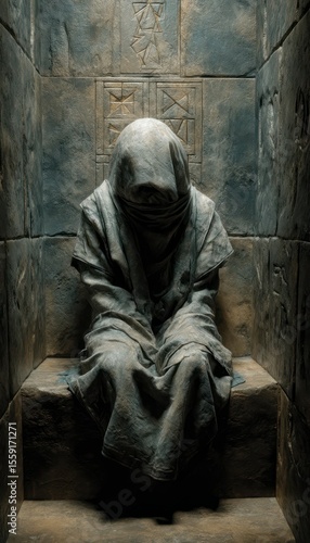 Enigmatic cloaked figure seated within weathered stone chamber, solitary confinement