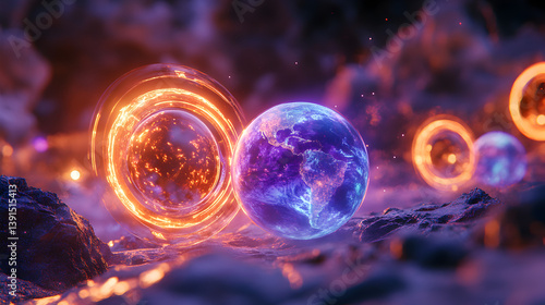 Enigmatic Cosmic Landscape Featuring Glowing Spheres and Earth Amidst Ethereal Cosmic Elements in a Surreal Universe Setting