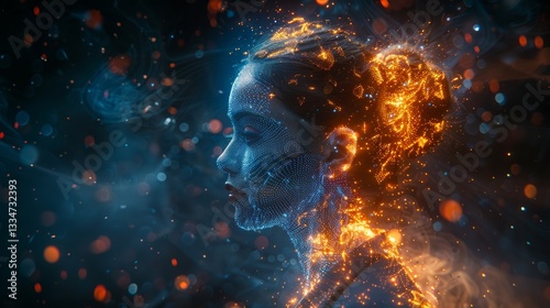 Enigmatic female profile ablaze with cosmic fire, illuminating beauty with celestial stardust and digital innovation, a vision of otherworldly elegance