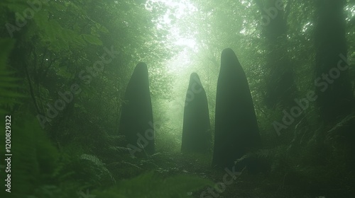 Enigmatic Figures in Foggy Forest Path