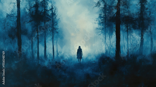 Enigmatic Forest Path: A solitary figure shrouded in mystery walks down a path through a dense, blue-hued forest, enveloped in an ethereal fog. The scene evokes a sense of intrigue and contemplation.