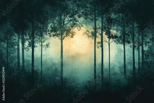 Enigmatic forest scene at dawn, trees silhouetted against a soft, ethereal light.