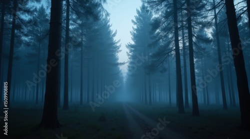 Enigmatic Twilight High-Definition Photo of a Foggy Pine Forest
