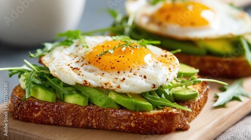 Enjoy a fresh serving of avocado toast, featuring perfectly fried eggs, arugula, and sliced avocado on crispy bread, presented on a wooden board for brunch.