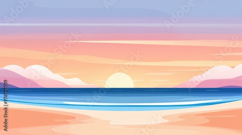 Enjoy a vibrant cartoon illustration showcasing a breathtaking ocean scene with a radiant sunset over a tranquil beach.