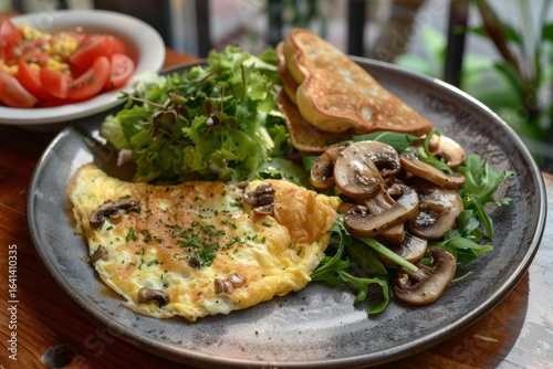 Enjoying a healthy and nutritious breakfast with omelette, mushrooms, pancakes and salad