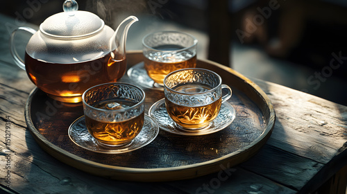 Enjoying a warm evening tea with a glass teapot and delicate cups on a rustic wooden table