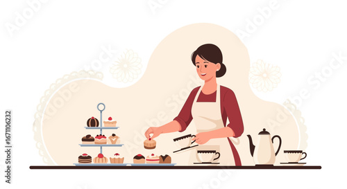 Enjoying Afternoon Tea: A Delightful Scene Featuring Cakes, Drinks, and a Beautiful Lady