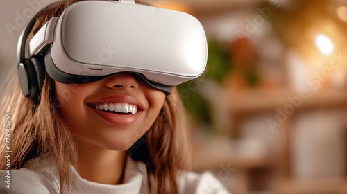 Enjoying an immersive virtual reality experience while smiling in a cozy indoor setting with soft lighting and modern decor
