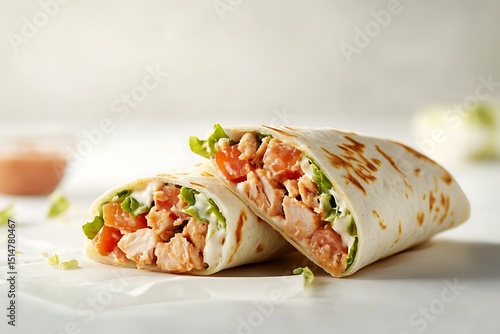 Enjoying Chicken Wrap Cut in Half with Vegetables and Sauce