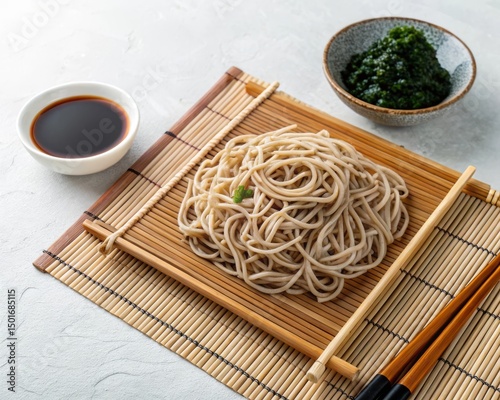 Enjoying cold soba noodles served on a zaru bamboo mat with dipping sauce and shredded toppings in a japanese cuisine setting