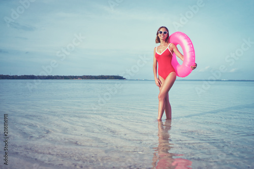 Enjoying suntan and vacation. Outdoor portrait of pretty young woman in red swimsuit with inflatable ring on tropical beach.