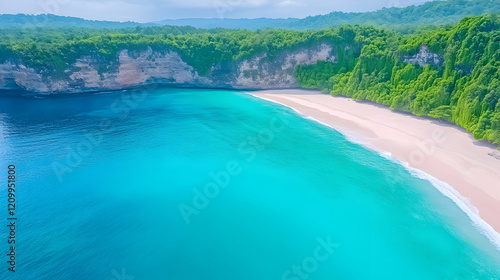 Enjoying the beautiful kelingking Beach in Nusa Penida. An impressive dinosaur shaped Cliff in Bali, Indonesia.