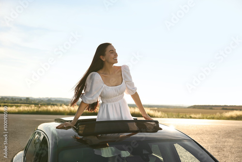 Enjoying trip. Smiling woman leaning out of car roof outdoors