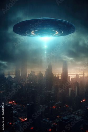 Enormous alien mothership looming over a futuristic city skyline, extraterrestrial invasion