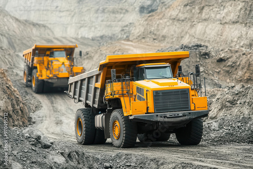 Enormous haul trucks on a mining site, transporting raw materials, Heavy industry mining logistics