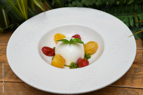 Ensalada caprese con burrata mozarella, tomates cherry y salsa pesto