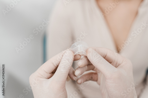 ENT doctor is holding airway nasal splints two pieces of plastic held inside nose. Nasal splints are installed in the nose during septoplasty to correct the deformity of nasal septum.