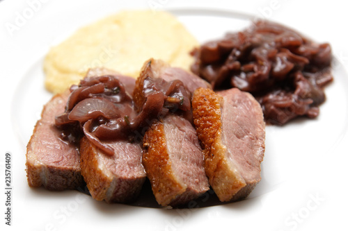 Entenbrust mit Kartoffelpüree und Rotwein-Zwiebelsosse